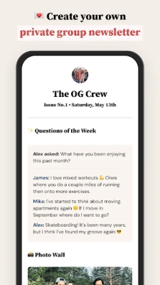 Letterloop is a fun way to have a group newsletter without the work. You pick the questions for your group to answer, then Letterloop creates a fun and beautiful newsletter with everyone's replies. All you need is to do is invite your people!