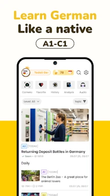 - Improve German reading skills with content selected from levels A1 to C1